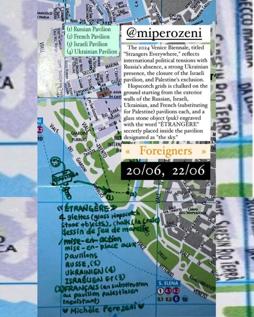 Dans ce contexte, j’ai choisi de me concentrer sur ces quatre pavillons: russe, israélien, ukrainien et français (en substitution au pavillon palestinien inexistant) pour y activer quatre glettes. (palet du jeu de marelle, en verre dans le nord de la France)